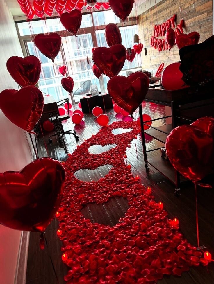 - Desired Luxury Package: Includes a 40-inch letter balloon banner, 20 latex ceiling balloons, a mini rose petal walkway with 6 heart-shaped foil balloons, twinkling mini candle lights, and 15 floor balloons. $350 (Includes Cleaning Kit)